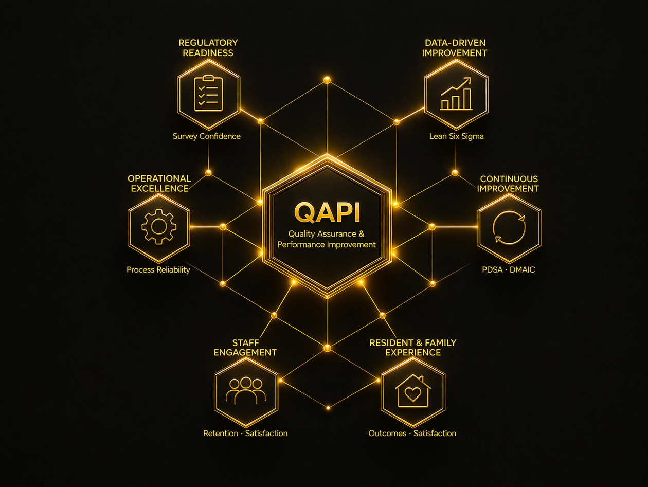 The holistic approach developed by QAPI Pro supports providers to simultaneously adhere to regulations, procure better outcomes for stakeholders, improve prestige in terms of care and service, and position facilities at a higher level of quality.